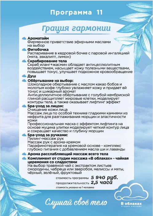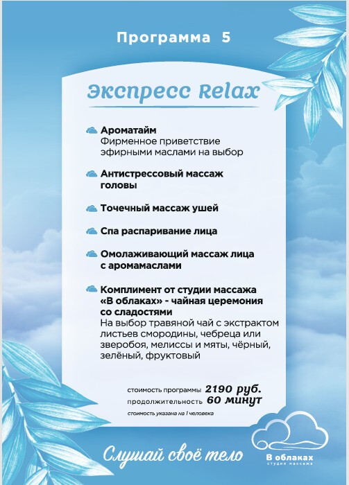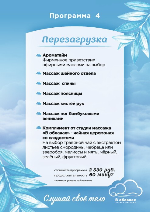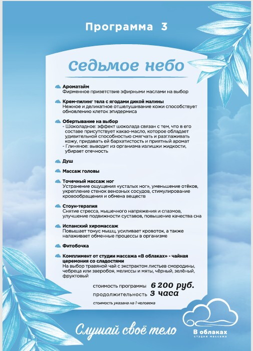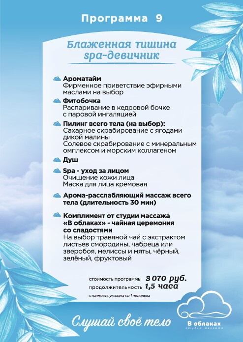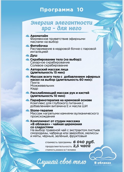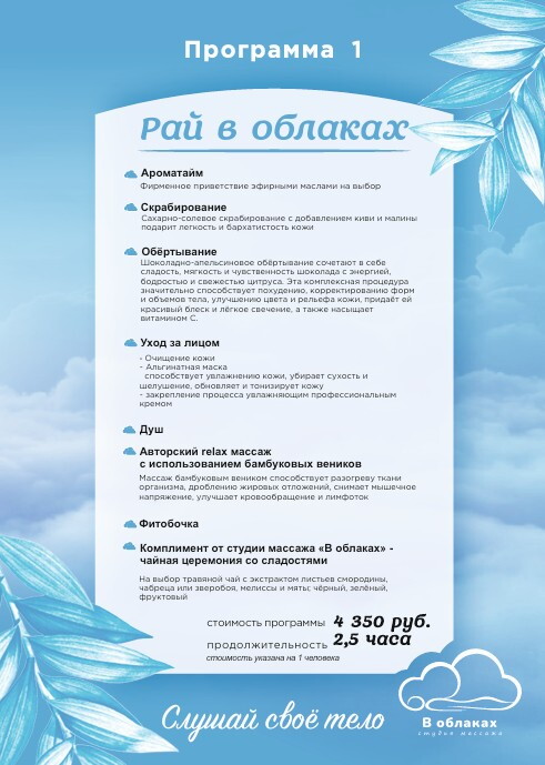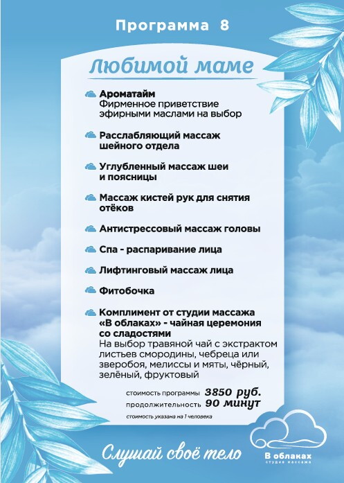 Добро пожаловать в студию массажа В облаках - компанию, сотрудники которой хорошо понимают, как ценна естественная красота, и виртуозно умеют ее взращивать и сохранять. Каждый из нас ежедневно подвергается воздействию большого количества угнетающих факторов: неблагоприятная экология, стрессы и нарушения режима питания, недосыпание и крайности климата... Все это не может не отражаться на внешности, и не всегда косметика помогает исправить положение. В студии массажа В облаках вам вернут красоту, которая идет изнутри!
