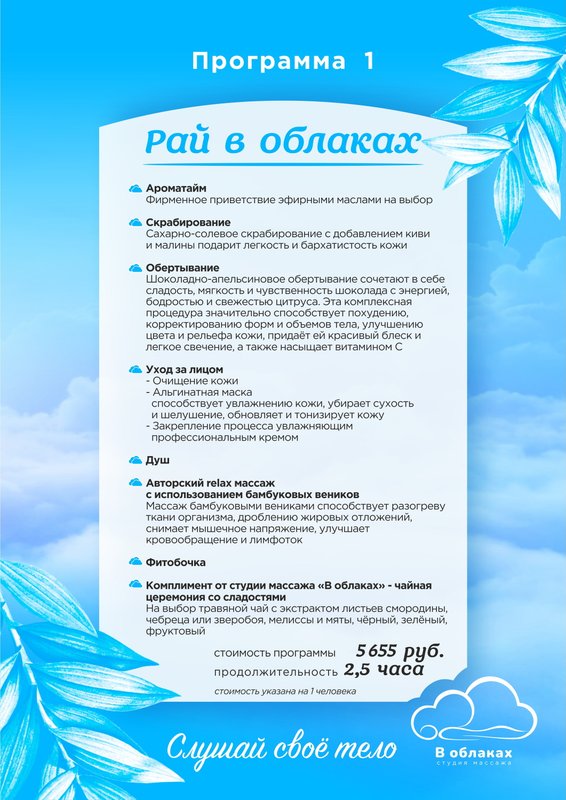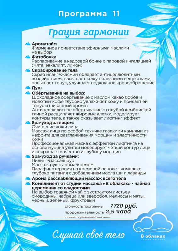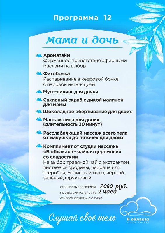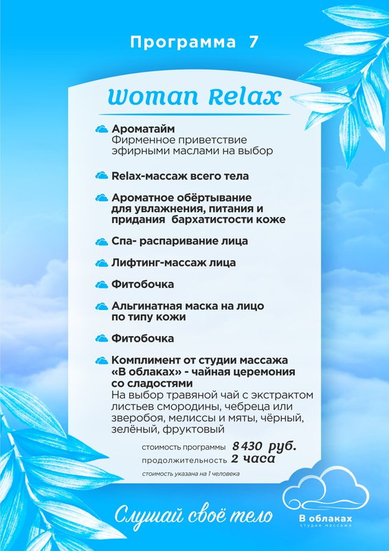 Приглашаем в студию массажа В облаках - место, где хорошо знают, как ценна естественная красота, и виртуозно умеют ее создавать и поддерживать. Каждый из нас регулярно подвергается воздействию различных угнетающих факторов: выхлопные газы, стрессы и нарушения режима питания, переутомление и хроническая усталость... Все это пагубно влияет на внешний вид, и далеко не всегда косметические средства помогают исправить положение. В студии массажа В облаках вам помогут восстановить здоровье и засиять естественной красотой!